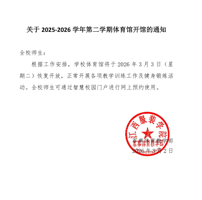 关于2025-2026学年第二学期体育馆开馆的通知