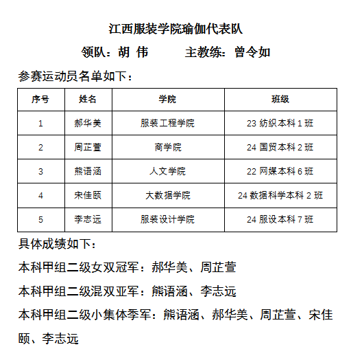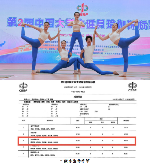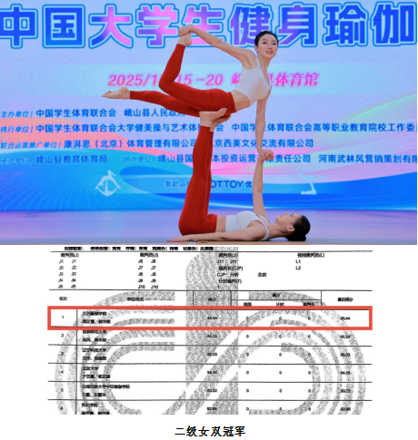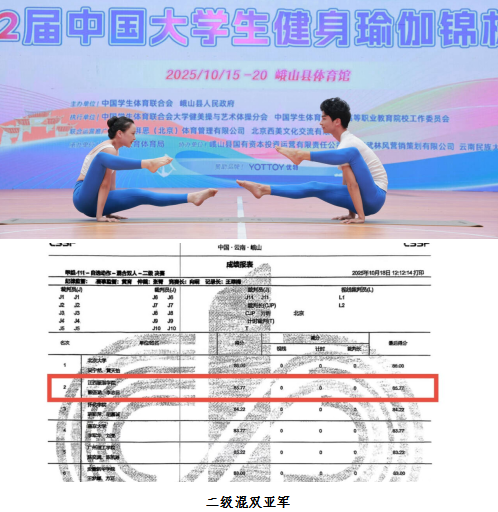 【军体部讯】金秋送爽,捷报频传。2025年10月15日至20日,由中国学生体育联合会主办的全国性顶级赛事——2025年中国大学生健身瑜伽锦标赛在云南峨山盛大启幕。我校瑜伽代表队在学校与部门的鼎力支持下,在主教练曾令如的带领下,凭借卓越技艺与沉稳心态,力克群雄,最终斩获本科甲组二级女双冠军、混双亚军、小集体季军,以傲人战绩为校争光!